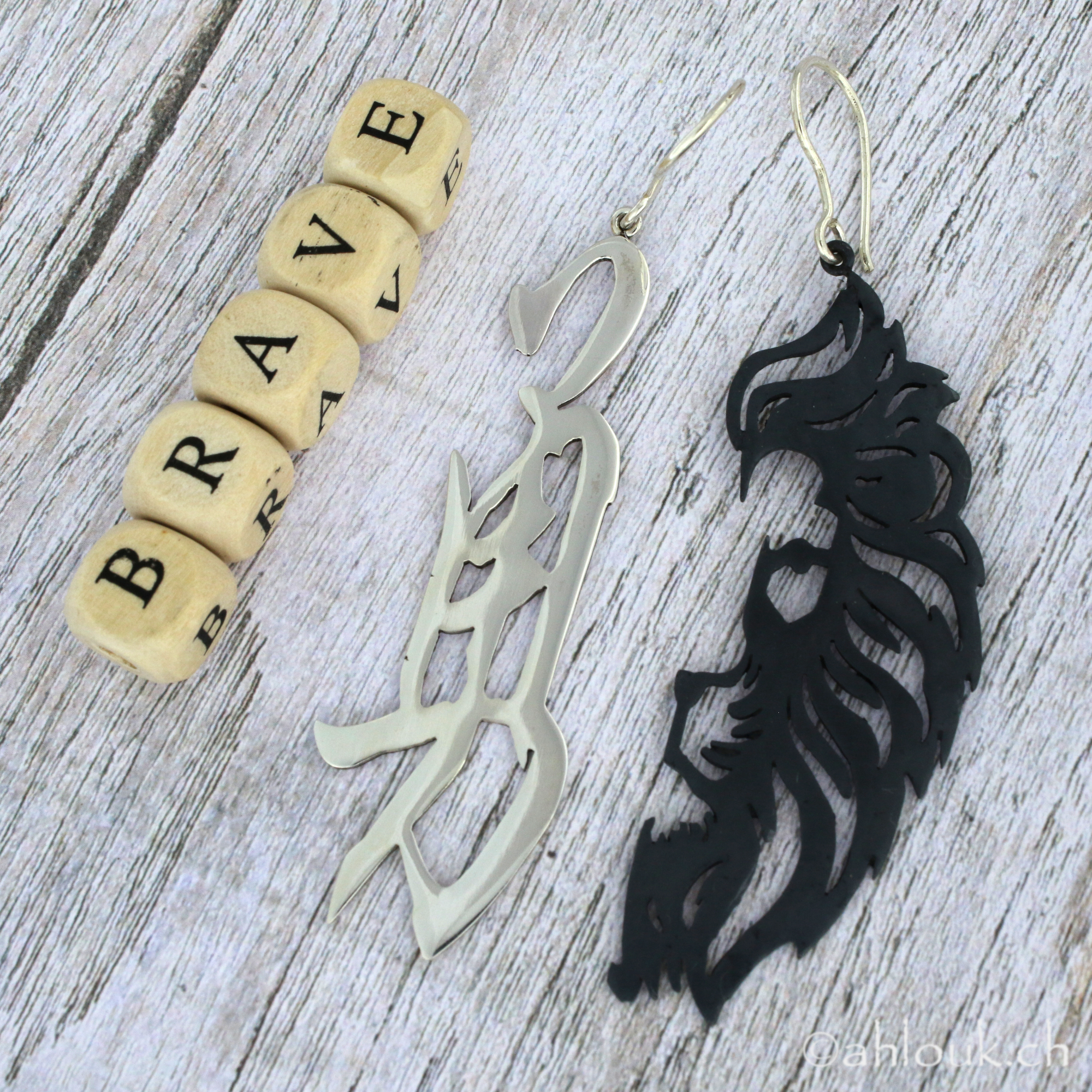 Lunghi orecchini asimmetrici ispirati al kanji “coraggioso”